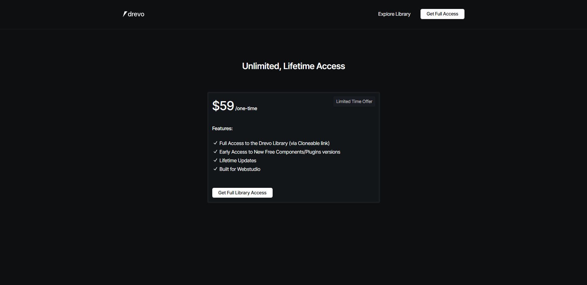 Start by purchasing the Drevo Library Pro License to receive the cloneable. This gives you immediate, lifetime access to our entire collection of components and plugins, with all future updates included. No subscriptions, no hidden fees.